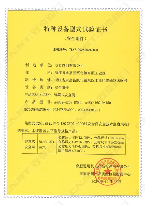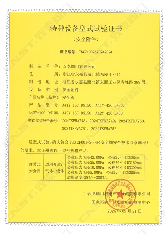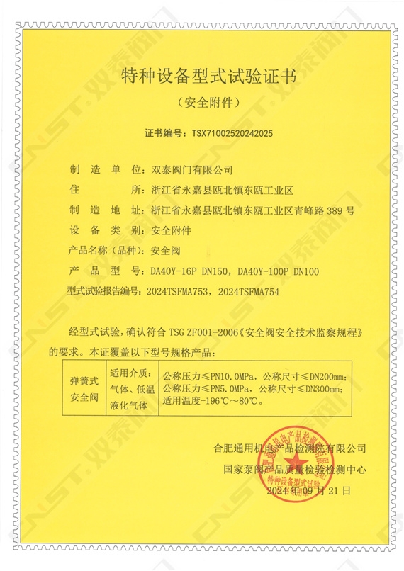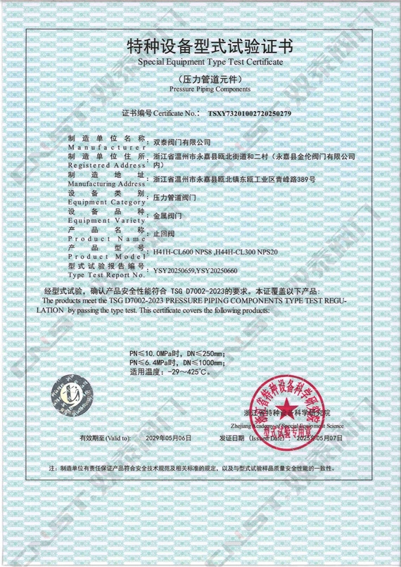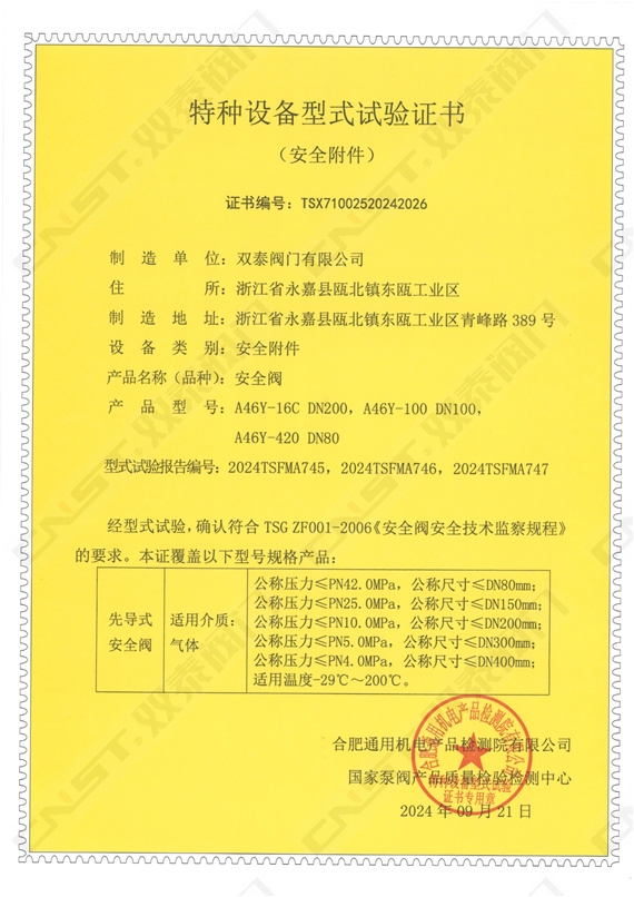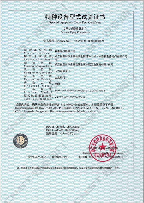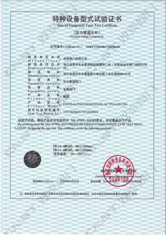 雙泰閥門自主研發生產的多種規格型號的蝶閥、球閥、閘閥、截止閥、止回閥等順利通過特種設備型式試驗,正式取得金屬閥門特種設備型式試驗證書。標志著雙泰閥門工廠秉承發展科技實力、嚴控產品質量、產品創新的精神,一如既往地獲得國家相關專業機構部門的認可。